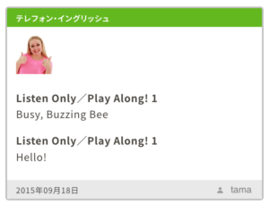 HOME > DWE > TE > DWE TE 2015/09/18 たまちゃんのTelephone English 2015年9月18日 2026年1月19日 2015/09/18 今日のたまちゃんのTEは、Listen Only / Play Along 1 の Busy, Bussing Bee Hello! の2曲でした! -DWE, TE