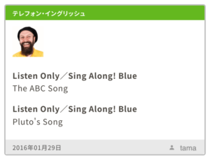 HOME > DWE > TE > DWE TE 2016/01/29 たまちゃんのTelephone English 2016年1月29日 2026年1月19日 2016/01/29 今日のたまちゃんのTEは、Listen Only / Sing Along! Blue の The ABC Song Pluto's Song の2曲でした! -DWE, TE