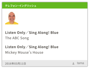 HOME > DWE > TE > DWE TE 2016/03/11 たまちゃんのTelephone English 2016年3月11日 2026年1月19日 2016/03/11 今日のたまちゃんのTEは、Listen Only / Sing Along! Blue の The ABC Song Mickey Mouse's House の2曲でした! -DWE, TE